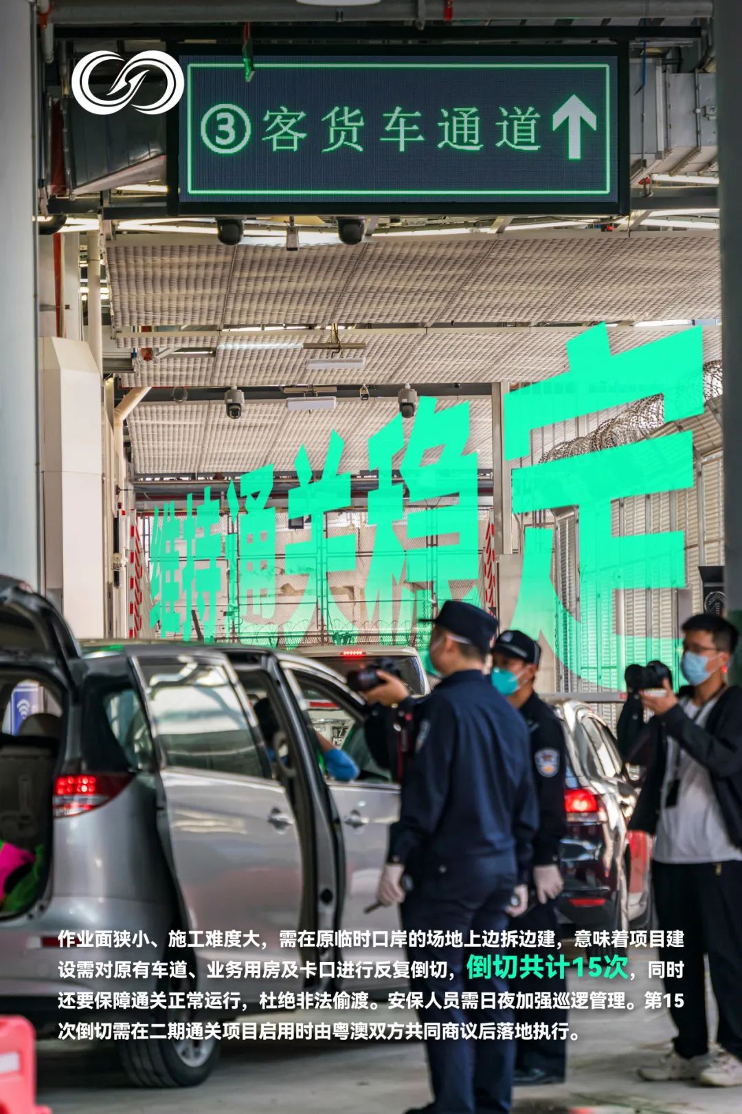 邊騰挪轉關、邊通關運行的特殊性,意味著項目建設需對原有車道、業務用房及卡口進行反復倒切。建設過程中,指揮部保持與粵澳兩地聯檢單位緊密溝通,根據工程進展和安全施工的要求對通關道路多次倒切(共計倒切15次)。為杜絕非法偷渡,指揮部在原有的粵澳分界圍網之外,增設防攀爬圍網,搭載監控設備,安排安保人員日夜巡邏,保障正常通關及邊境安全。