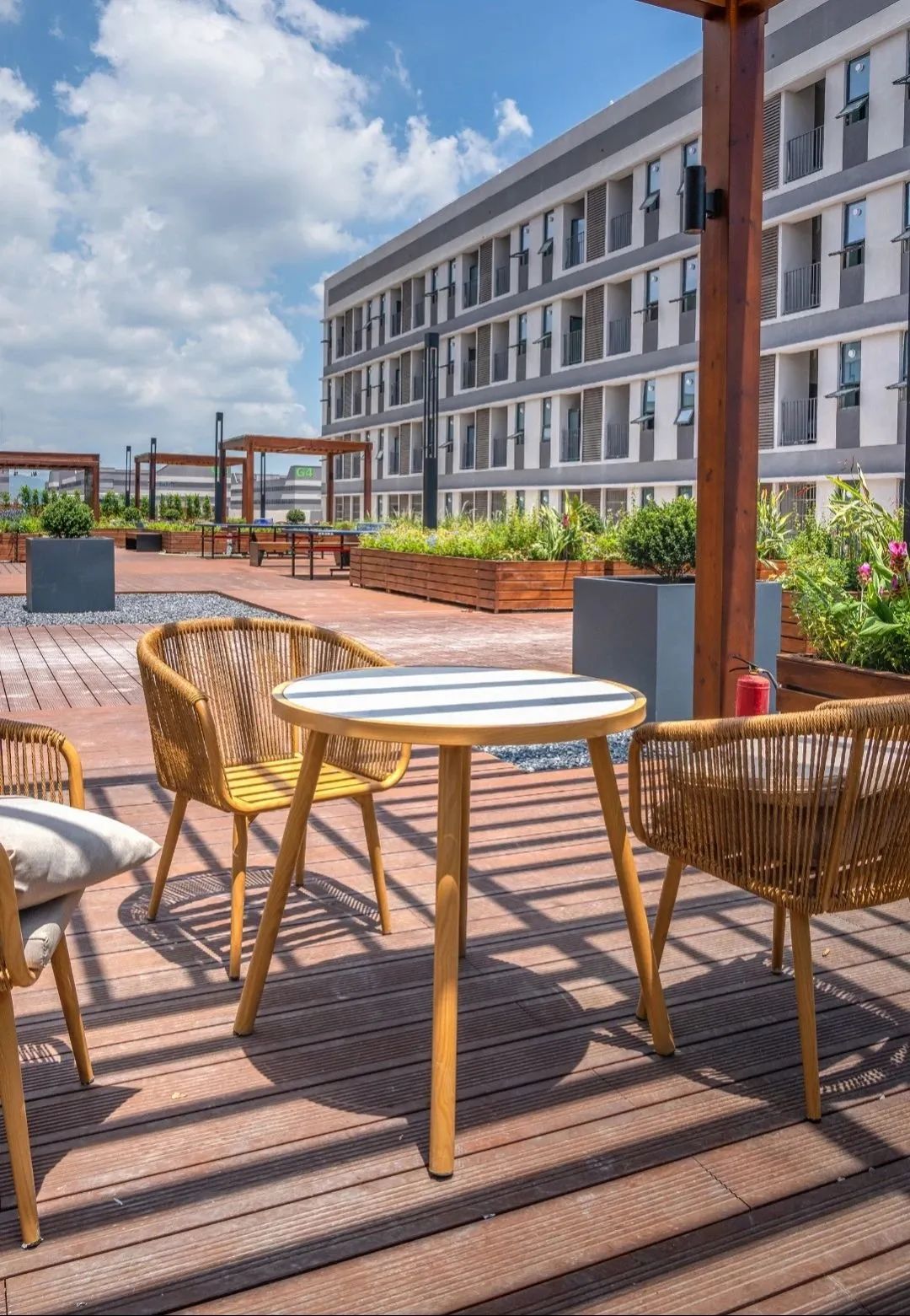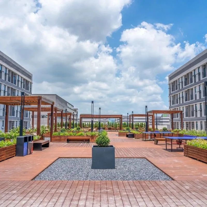 公共服務中心三層平臺設置了屋頂花園,形成半開放式創(chuàng)新社區(qū)。考慮到公共服務中心宿舍的分布,屋頂花園位于兩側(cè)宿舍動線中軸。