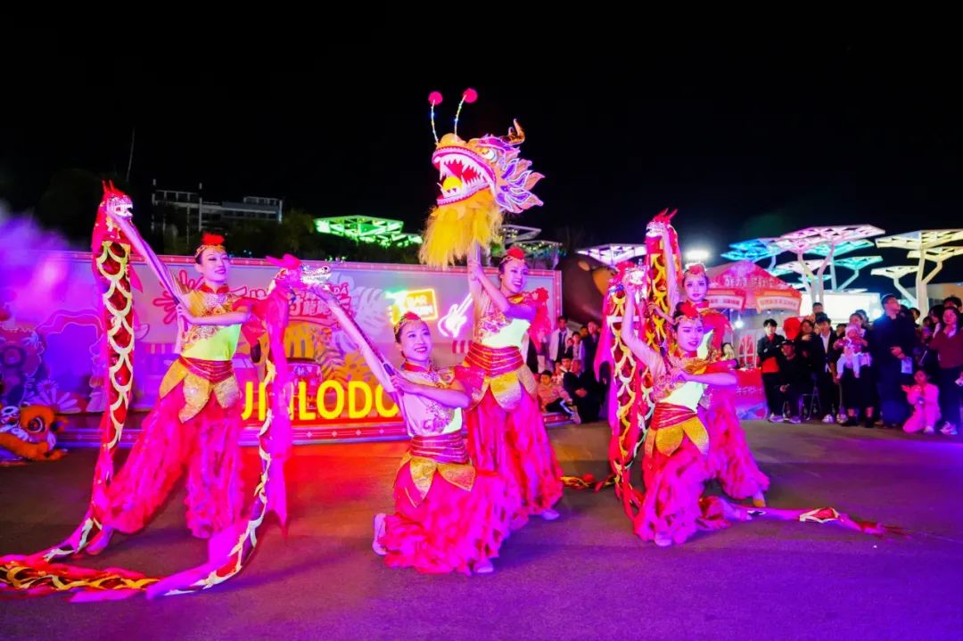 歡慶甲辰龍年元宵佳節的橫琴星樂度·露營小鎮,絢麗燈光流光溢彩,以傳統文化和沉浸式光影場景打造一個“不夜城”。