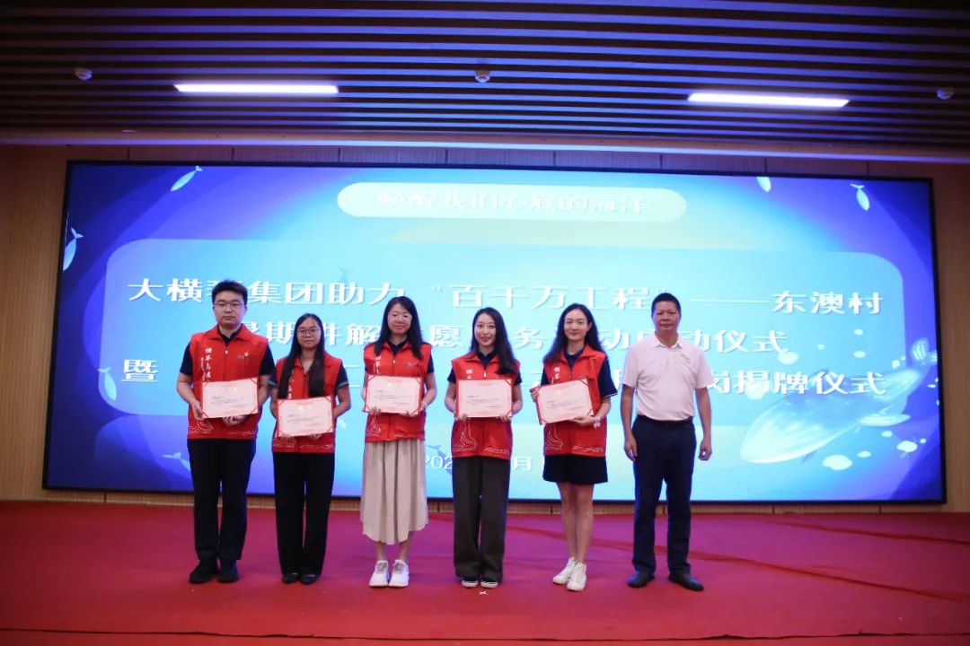儀式上,共青團珠海市委員會權益與社會工作部部長王臻,珠海市萬山鎮人民政府黨委副書記、鎮長黃軒流,珠海大橫琴集團有限公司黨委副書記戴碩濤,珠海市萬山鎮東澳村書記石志明,萬山海洋生物科普館館長安東共同為“百千萬工程”青年志愿服務崗揭牌,啟動助力“百千萬工程”——東澳村暑期講解志愿服務活動。