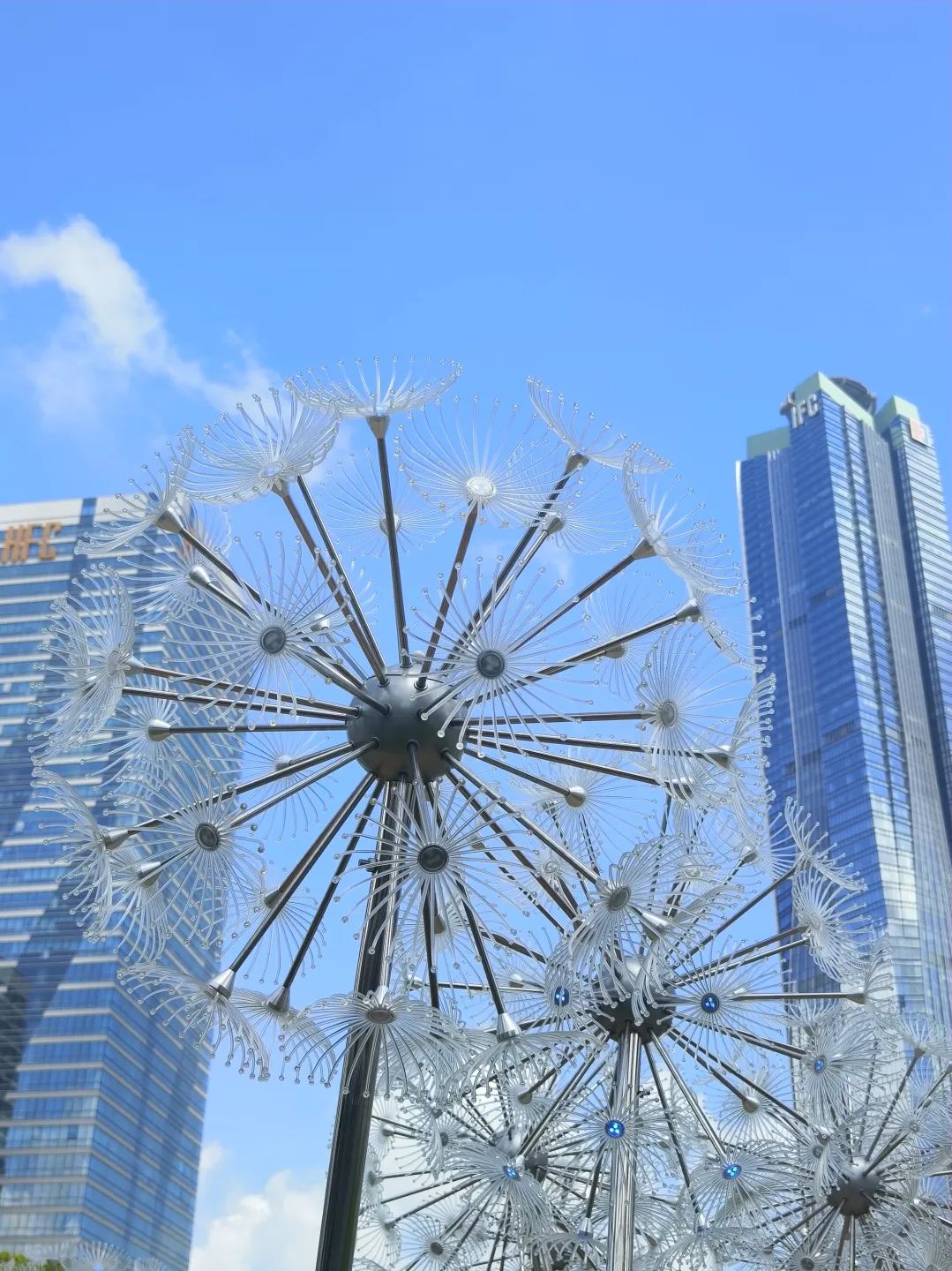 在橫琴金融島中央公園,40支高度為2.5米、直徑為0.6米的蒲公英燈飾如同希望的使者,散發著明亮而溫暖的光芒,為夜幕下的公園增添了一份璀璨的光彩。