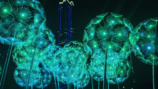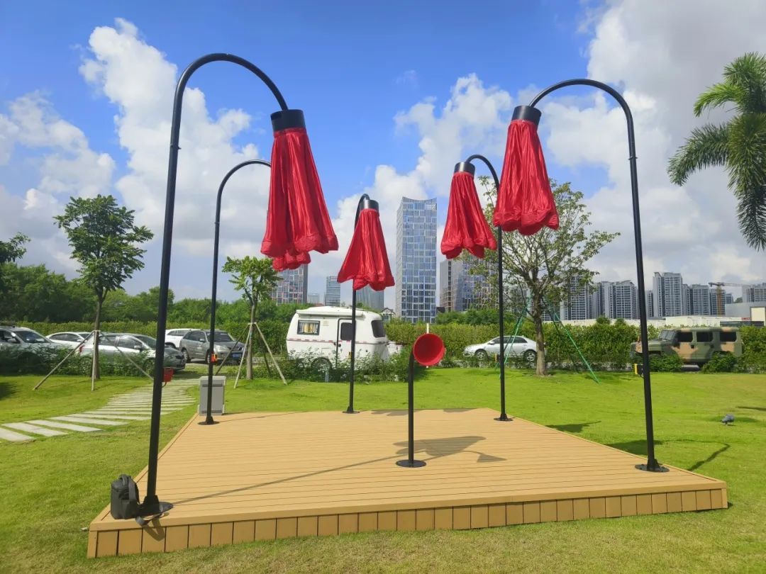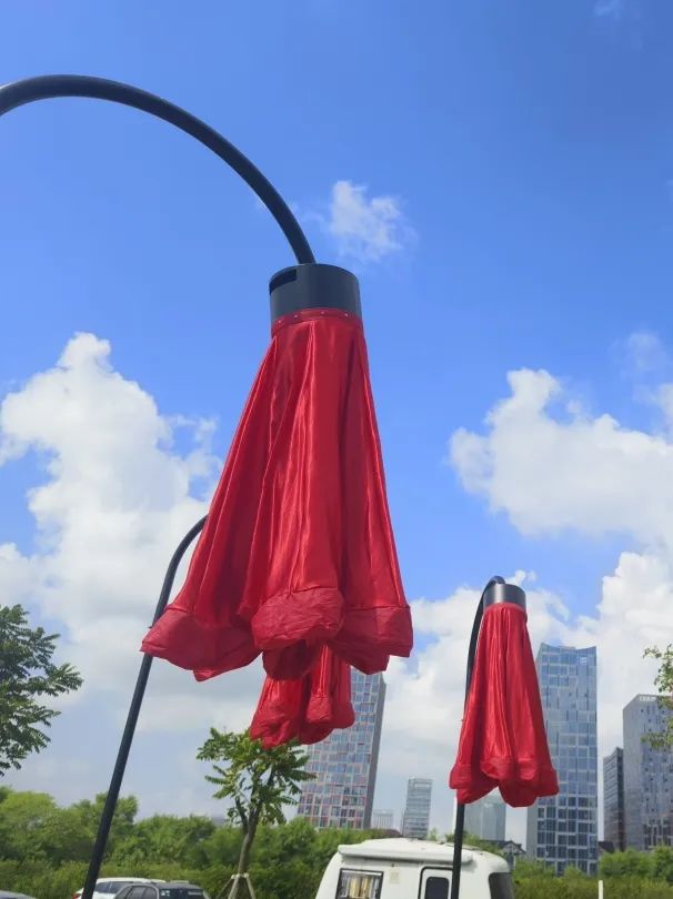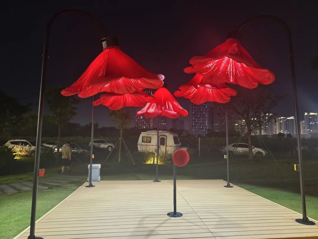 橫琴生態澤園的創意燈飾以含苞待放的喇叭花為主體造型,花朵使用充氣物料制成,內部藏有感應器。
