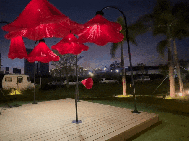 夜晚,當游人經過,在喇叭裝置處說出“熱烈慶祝中華人民共和國成立75周年”、“熱烈慶祝澳門回歸祖國25周年”等祝福語時,花朵會自動打開并亮燈,創造出驚喜的互動體驗。