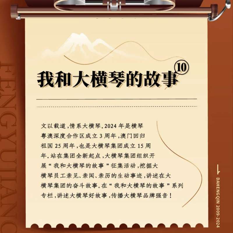 文以載道,情系大橫琴。2024年是橫琴粵澳深度合作區(qū)成立3周年,澳門回歸祖國(guó)25周年,也是大橫琴集團(tuán)成立15周年。站在集團(tuán)全新起點(diǎn),大橫琴集團(tuán)組織開(kāi)展“我和大橫琴的故事”征集活動(dòng),挖掘大橫琴員工親見(jiàn)、親聞、親歷的生動(dòng)事跡,講述在大橫琴集團(tuán)的奮斗故事。大橫琴集團(tuán)公眾號(hào)將陸續(xù)推出“我和大橫琴的故事”系列專欄,講述大橫琴好故事,傳播大橫琴品牌強(qiáng)音!